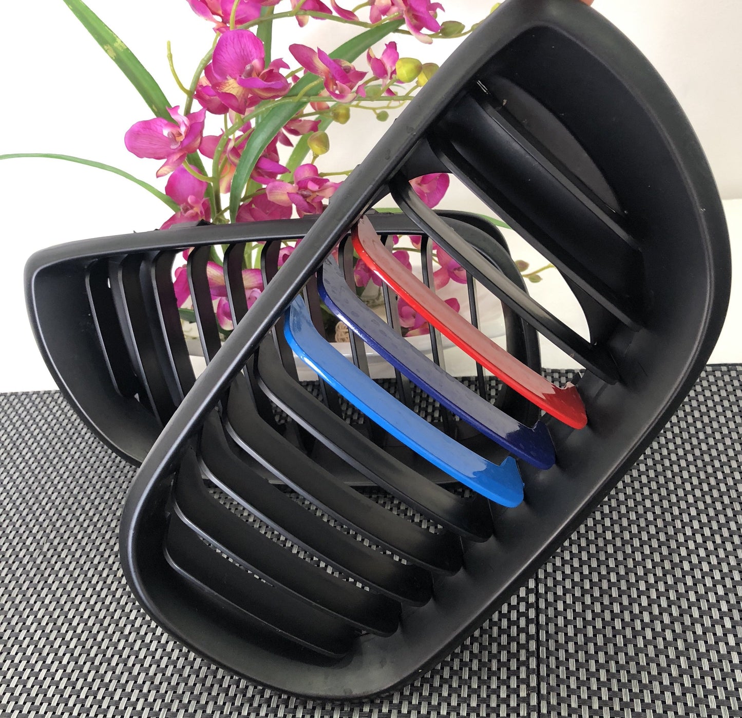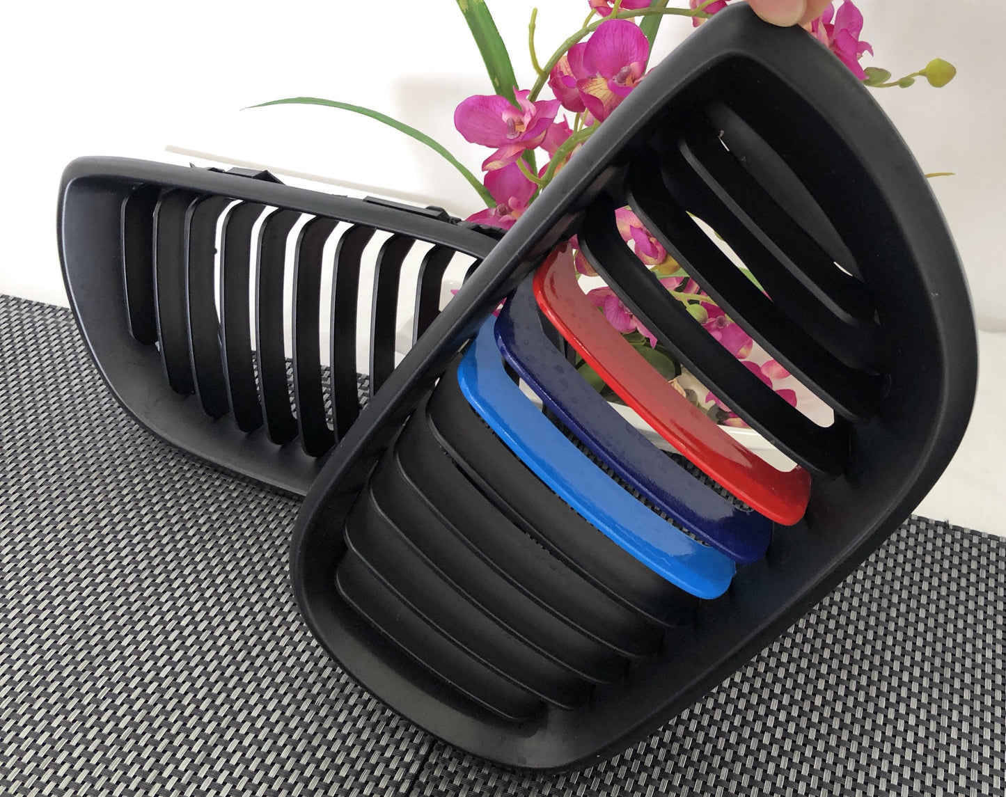 Transforma la presencia de tu vehículo con estas riñoneras (también conocidas como rejillas o parrillas delanteras) diseñadas exclusivamente para tu BMW. El acabado en negro mate, complementado con las icónicas tres rayas de los colores M, confiere un look agresivo y moderno que no pasará desapercibido. Es la actualización definitiva para el entusiasta que busca la perfección en cada detalle.