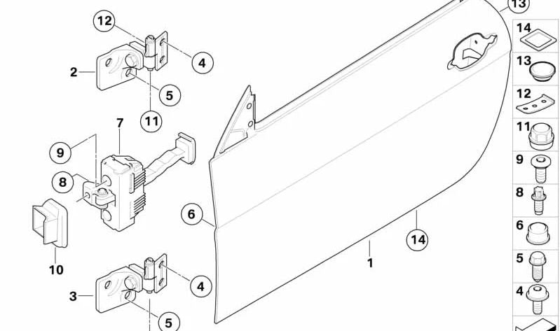 This door hinge is an original BMW piece, specifically designed to ensure the correct operation and adjustment of the vehicle door in the lower left. Its material and design guarantee durability and perfect adjustment.