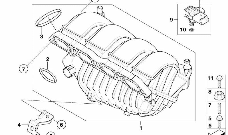 OEM admission collector 11617605733 for Mini R55, R56 (One, N12) with manual or automatic change. Models manufactured between 2007 and 2010. Original mini replacement.