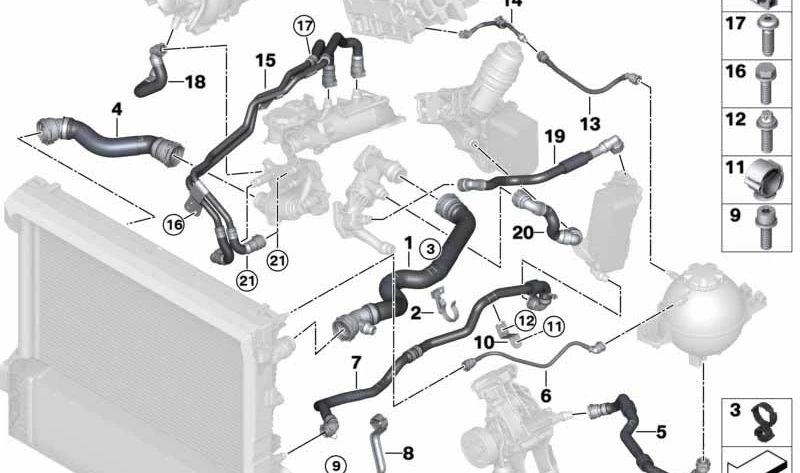 Manguera del radiador OEM 17128579335 para BMW G05, G06, G07 (X5, X6, X7 xDrive30d). Recambio original BMW para sistema de refrigeración.