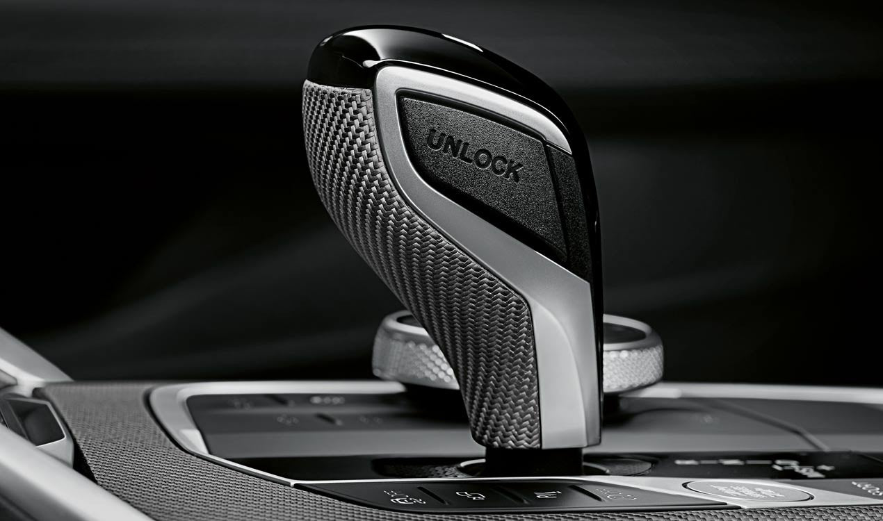 Selector de marchas reinterpretado: la forma ergonómica de las carcasas de los puños traseros y su material especial garantizan una experiencia de conducción dinámica y deportiva. La palanca selectora M Performance está disponible en dos variantes: con cubiertas de agarre hechas de tela de carbono 1K de poro abierto o Alcantara. En ambas variantes, la insignia M metálica se colocó en la parte superior como un punto culminante especial.