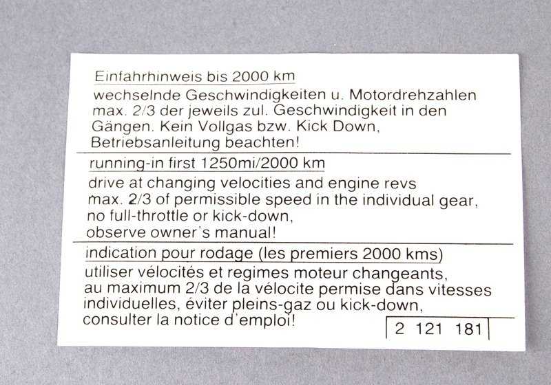 Placa de advertencia sobre instrucciones de rodaje para BMW Serie 3 E21, E30, E36, Serie 5 E12, E28, Serie 6 E24, Serie 7 E23, E32, E38, Serie 8 E31 (OEM 51142121181). Original BMW