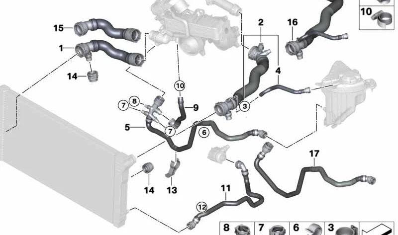 Soporte de manguito OEM 17127619697 para BMW F10 y F07 (modelos 520i, 528i, 530d, 530d xDrive). Pieza del sistema de refrigeración. Original BMW.