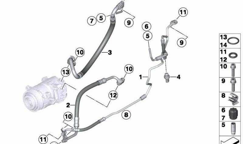 La tubería de presión del compresor es un componente esencial para el correcto funcionamiento del sistema de aire acondicionado en su BMW. Esta pieza de alta calidad, fabricada por BMW, garantiza un rendimiento óptimo y es compatible con modelos específicos de la marca, asegurando una perfecta adaptación.