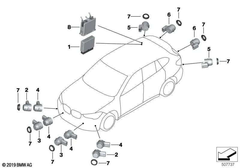 Sensor ultrassônico Dark Shadow para BMW F45, F45N, F46, F46N, G32, F39, G01, G08, F26, G02 (OEM 66207850461). BMW original